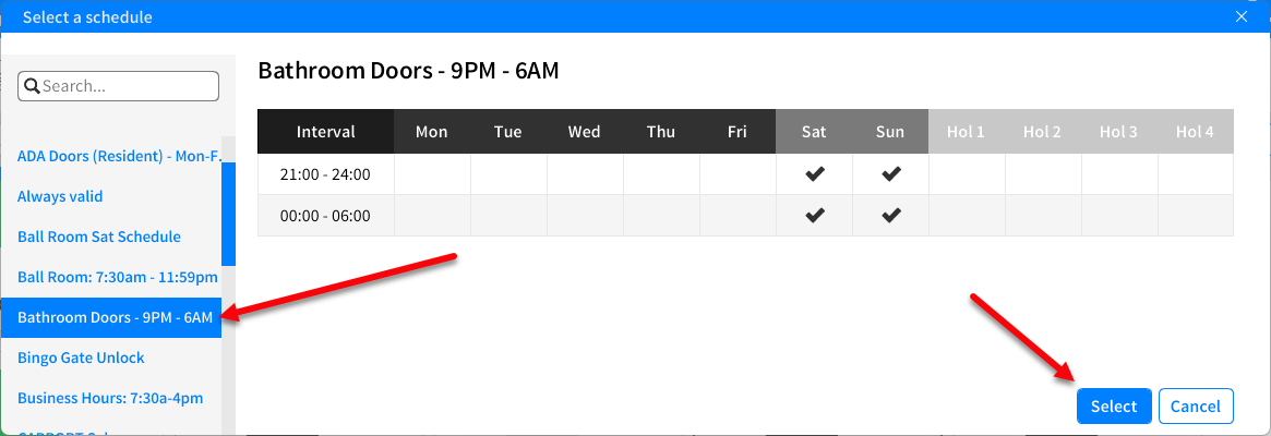 Choose the schedule from the left-hand side that you created for the door then click on select