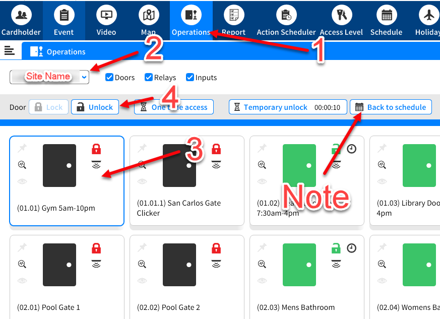 - In the top left drop-down window, choose the site where the door is located you are unlocking