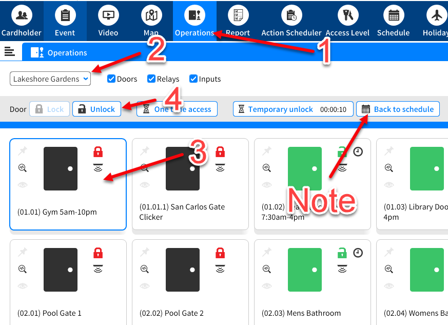 - In the top left drop-down window, choose the site where the door is located you are unlocking